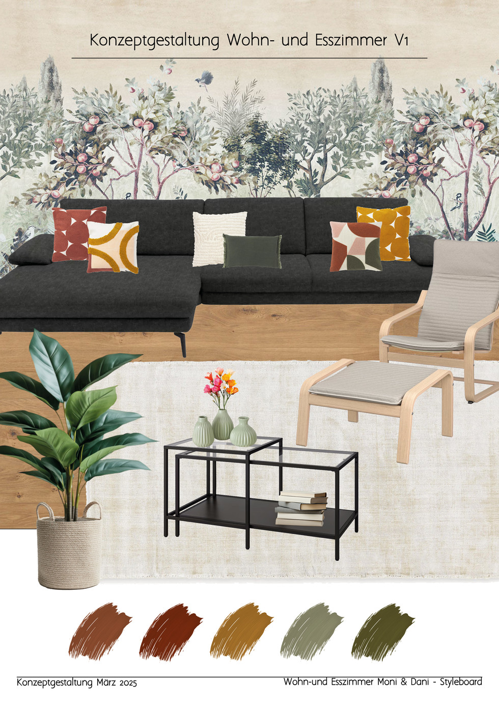 I developed a 2D interior concept for a young family, designing a combined living and dining area within a single open space. While some existing furniture was retained, I designed a custom built-in cabinet with an integrated desk tailored to the clients’ needs and preferences. The project also included a cohesive color concept, introducing carefully selected accent colors that harmonize with the existing white and natural material palette. Additionally, I designed the dining bench for the kitchen island, creating a functional and visually balanced solution within the space.